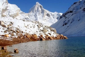 Milam Glacier is a major glacier of the Kumaun Himalaya. It is located in the tehsil of Munsiyari, part of the Pithoragarh district of Uttarakhand, India, about 15 km northeast of Nanda Devi. Milam Glacier is situated on the south facing slope of the main Himalayan range. It originates from the eastern slope of Trishuli and the southern slope of its eastern subsidiary Kohli. The subsidiary glaciers coming off the peaks of Hardeol, Mangraon (6,568 m), Deo Damla(6,637 m), and Sakram (6,254 m) on the eastern rim of the Nanda Devi Sanctuary flow into it from the west, while on the east it is fed by glaciers from Nanda Gond (6,315m) and Nanda Pal (6,306 m). The glacier is the source of the Goriganga River. The village of Milam lies near the snout of the glacier. Munsiyari, further down the Goriganga valley, is the base for the trek to the glacier.